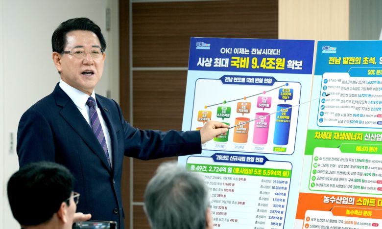 김영록 전남도지사는 29일 오전 도청에서 정부예산안 반영 언론 브리핑을 열고 “국민주권 정부 기조에 부합하는 전략과 시군·지역 국회의원과의 협업을 통해 노력한 결과로 의미있는 성과를 거둘 수 있었다”고 말했다.