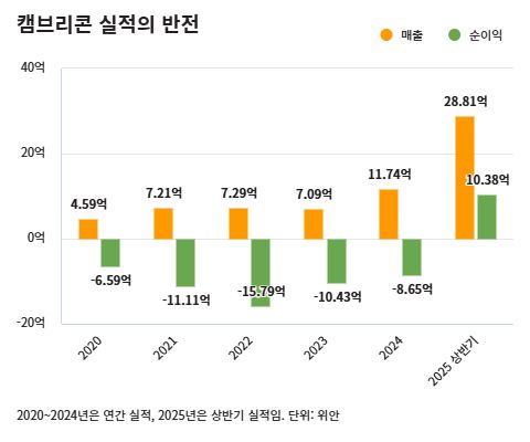 2025년, 캠브리콘의 잠재력이 폭발하기 시작합니다. 상반기 매출 성장률 무려 4348%(2024년 상반기 126억원→2025년 상반기 5594억원), 순이익은 1000억원 적자에서 2000억원 흑자로 뒤바뀌었습니다. 이제 만년 적자 기업은 간데없고, 매출액 총이익률 36%의 건실한 기업으로 환골탈태했죠.
