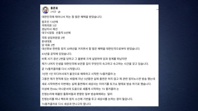 홍 전 시장은 나머지 인생을 대한민국에 보은할 길이 무엇인지 숙고하는 시간을 가지고 있다고도 적었습니다.