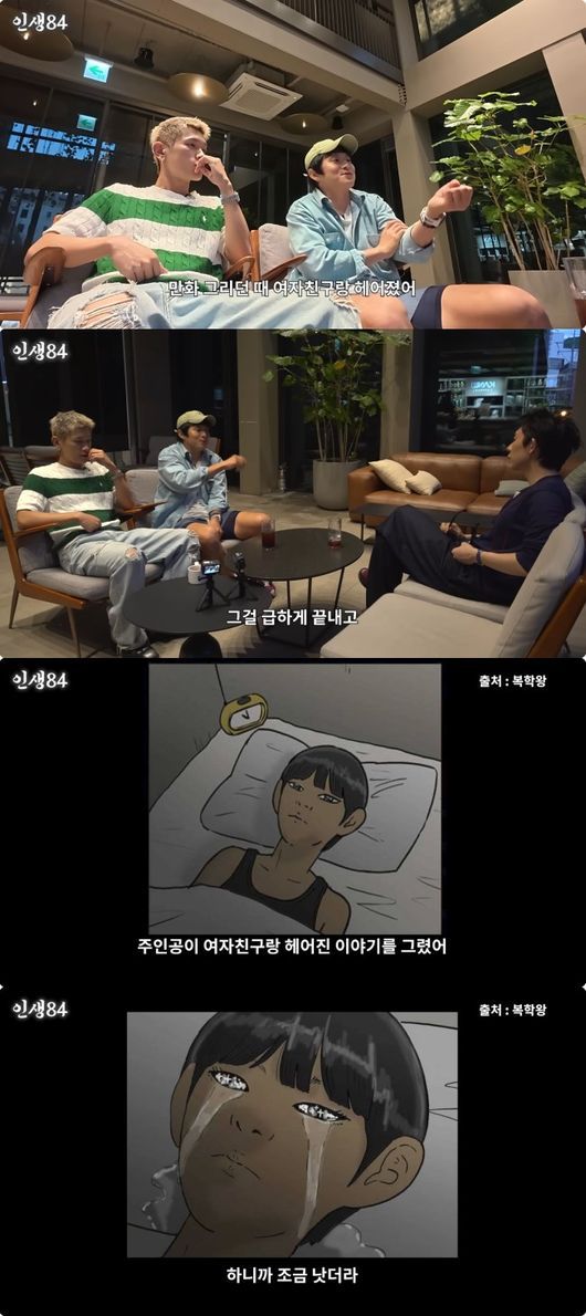 코드 쿤스트는 기안84에게도 “형도 그림 그리다 보면 그렇지 않아?”라고 물었고, 기안84는 “난 그런 적 있다. 만화 그릴 때 여자친구랑 헤어졌다. 원래 다른 이야기가 있었는데 그거 급하게 끝내고 주인공이 여자친구랑 헤어진 이야기를 그렸다. 하니까 조금 낫더라”라고 털어놨다. 여자친구와의 이별 경험을 만화에 담아내면서 감정을 해소한 것이었다.