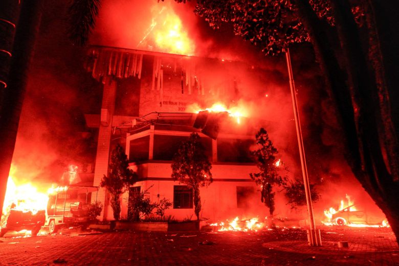 29일 인도네시아 남부 술라웨시주 마카사르에서 시위가 격화되던 중 마카사르 시의회 건물에 불이 났다. 이 화재로 최소 3명이 사망한 것으로 알려졌다. AFP연합뉴스 |