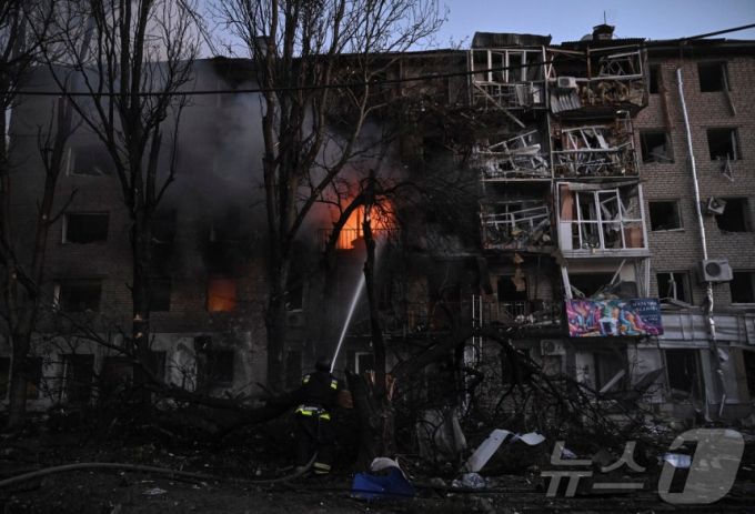 30일(현지시간) 우크리나 자포리자의 한 아파트 건물에서 한 소방관이 진화 작업을 벌이고 있다. 밤사이 러시아군 공습으로 자포리자에서 최소 1명이 숨지고 어린이 2명을 포함해 24명이 부상을 입었다./로이터=뉴스1