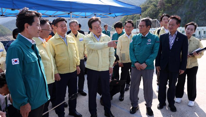 30일 오후 강릉 오봉저수지를 방문해 가뭄 상황을 점검하고 있는 이재명 대통령. 연합뉴스 |
