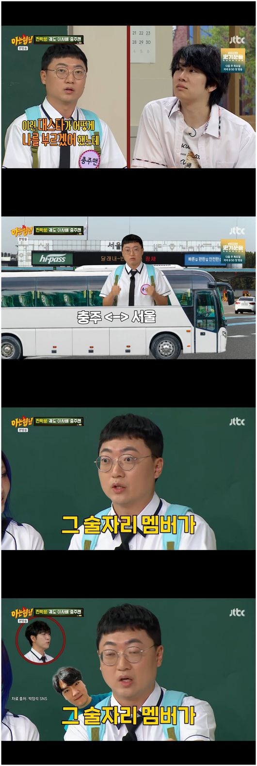 충주맨은 “김희철이 술자리를 불러주더라. 이런 스타들은 어떻게 술을 마실까 궁금해서 갔다”라고 말했다. 당일 오후 연락을 받고 다음날 휴가까지 내고 올라갔다는 충주맨. 그는 “연예인들은 불 타는 샴페인, 막 호텔 테라스 끝에서 마시는 줄 알았다. 그런데 포장마차더라. 그런데 그냥 찌개가 나오더라. 멤버도 궤도, 이석훈, 박정석이 왔더라”라며 다소 실망스러운 목소리로 그때 상황을 전했다.