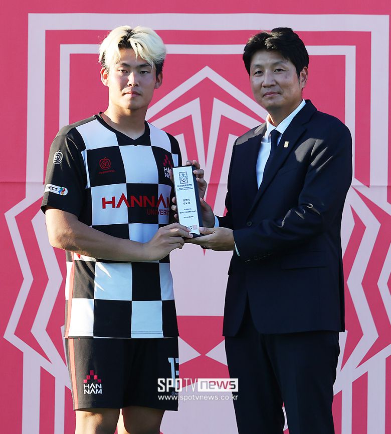 [스포티비뉴스=합천(경남), 곽혜미 기자] 제 20회 1,2학년 대학축구연맹전 죽죽장군기 한남대와 호남대의 결승전이 30일 오후 경상남도 합천공설운동장에서 열렸다. 1-0으로 한남대의 우승. 김병지 GK상을 수상한 한남대 황준모가 대한축구협회 박준호 한국대학축구연맹 부회장과 기념 촬영을 하고 있다. <저작권자 ⓒ SPOTV NEWS. 무단전재 및 재배포 금지>이 기사의 카테고리는 언론사의 분류를 따릅니다.0공유하기