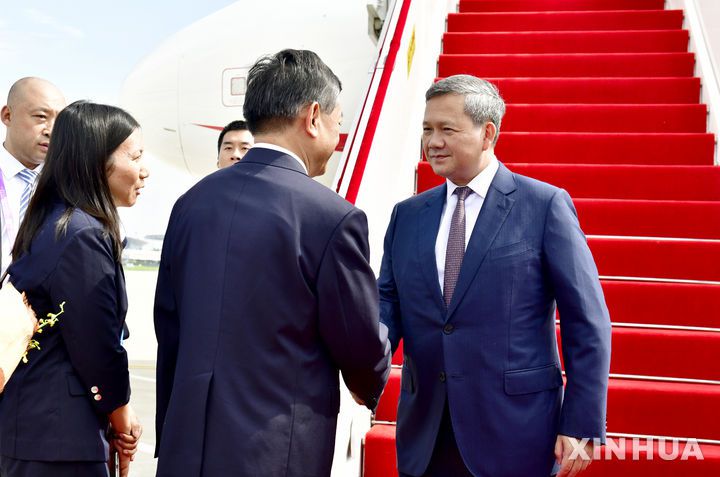 [톈진=신화/뉴시스] 훈 마넷 캄보디아 총리가 30일 톈진에 도착해 중국측의 영접을 받고 있다. 2025.08.30.