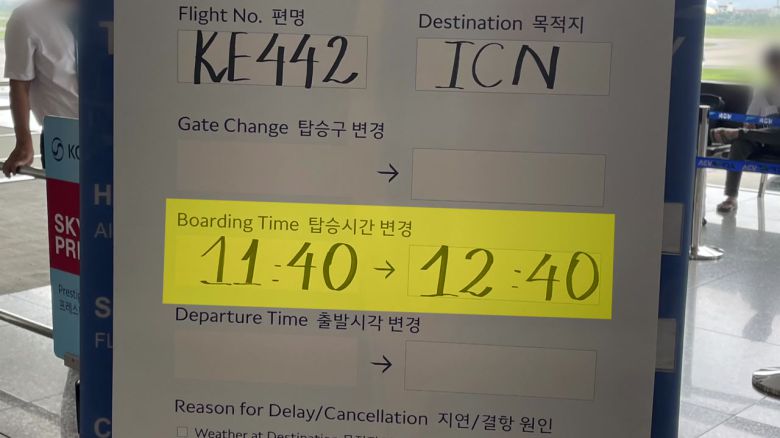베트남 하노이 공항, 현지시각 오전 11시 40분인 인천행 대한항공 여객기 탑승 시간을 1시간 미룬다는 안내문이 붙어 있습니다.