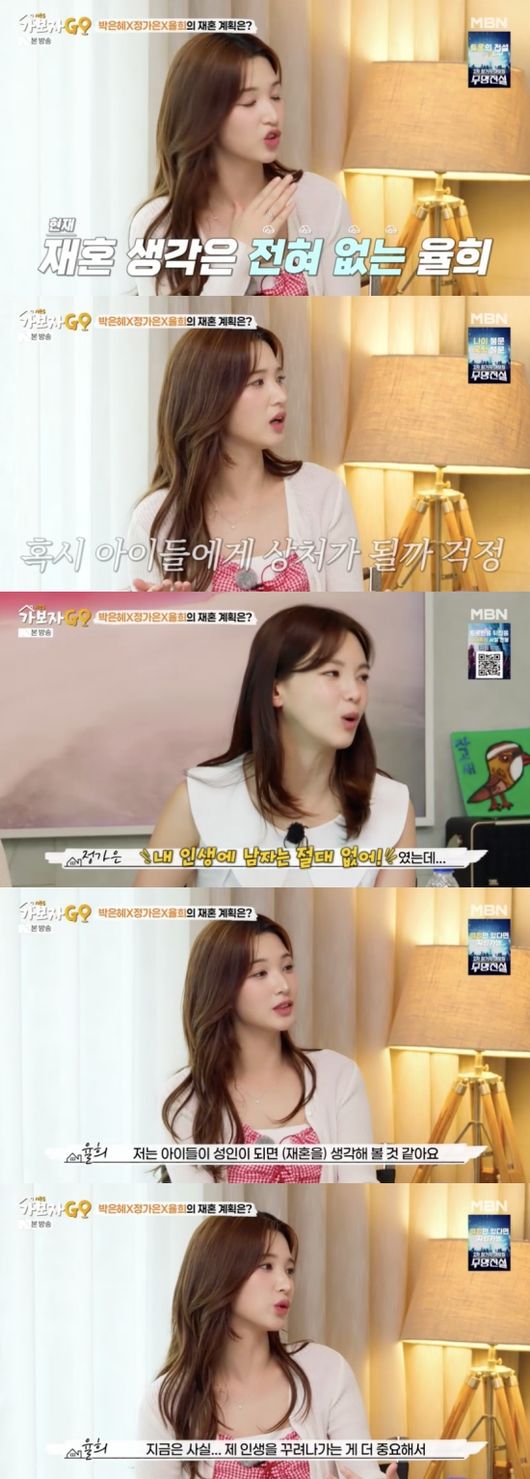 율희는 “아이들이 성인이 되면 생각해 볼 것 같다. 그때는 연애도 생각해 볼 수 있지 않을까. 지금은 제 인생을 꾸려나가는 게 더 중요하다”라고 말했다.
