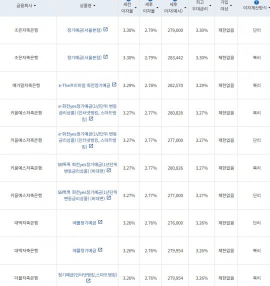 이어 키움예스저축은행의 e-회전yes정기예금(1년단위 변동금리상품)(인터넷뱅킹, 스마트뱅킹)과 SB톡톡 회전yes정기예금(1년단위 변동금리상품)(비대면)은 연 3.27%의 금리를 선보였다. 세후 이자는 복리 기준 28만원, 단리 기준 27만7000원이다.