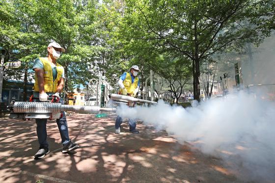 지난 20일 오전 대구 남구 주택가 영선공원에서 남구보건소 방역반 관계자들이 말라리아를 비롯해 여름철 각종 감염병 매개체인 모기 등 해충을 박멸하기 위해 방역을 하고 있다. 뉴스1