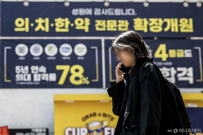 [서울=뉴시스] 정병혁 기자 = 28일 서울 강남구 대치동 학원가 앞에서 학생들이 이동하고 있다. 2025.04.28. /사진=정병혁 |