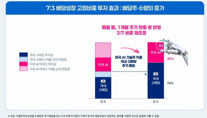 SCHD를 비롯해 국내 투자자들이 선호하는 배당성장 ETF의 경우 배당금이 꾸준히 늘어나는 종목들에 투자해 배당 성장을 이루는 구조라면 KIWOOM한국고배당&미국AI테크는 배당주의 수를 늘려 배당을 늘리는 데 초점을 맞췄다. 이경준 키움투자자산운용 ETF운용본부장은 "고성장과 고배당주를 결합해 구조적으로 배당금이 늘어나게 하는 특징을 가졌다"며 "2세대 배당성장 ETF"라고 말했다.