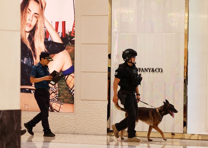 지난 11일 광주 서구 신세계백화점에서 경찰특공대 탐지견이 폭발물 탐색을 하고 있다. [사진 출처 = 연합뉴스]
