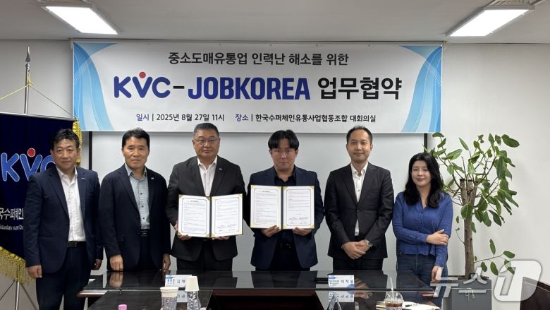 한국수퍼체인유통사업협동조합이 지난 27일 조합 대회의실에서 국내 대표 채용 플랫폼 잡코리아와 '중소도매유통업 인력난 해소를 위한 구인 광고 업무지원 협약을 맺었다 (중기중앙회 제공)