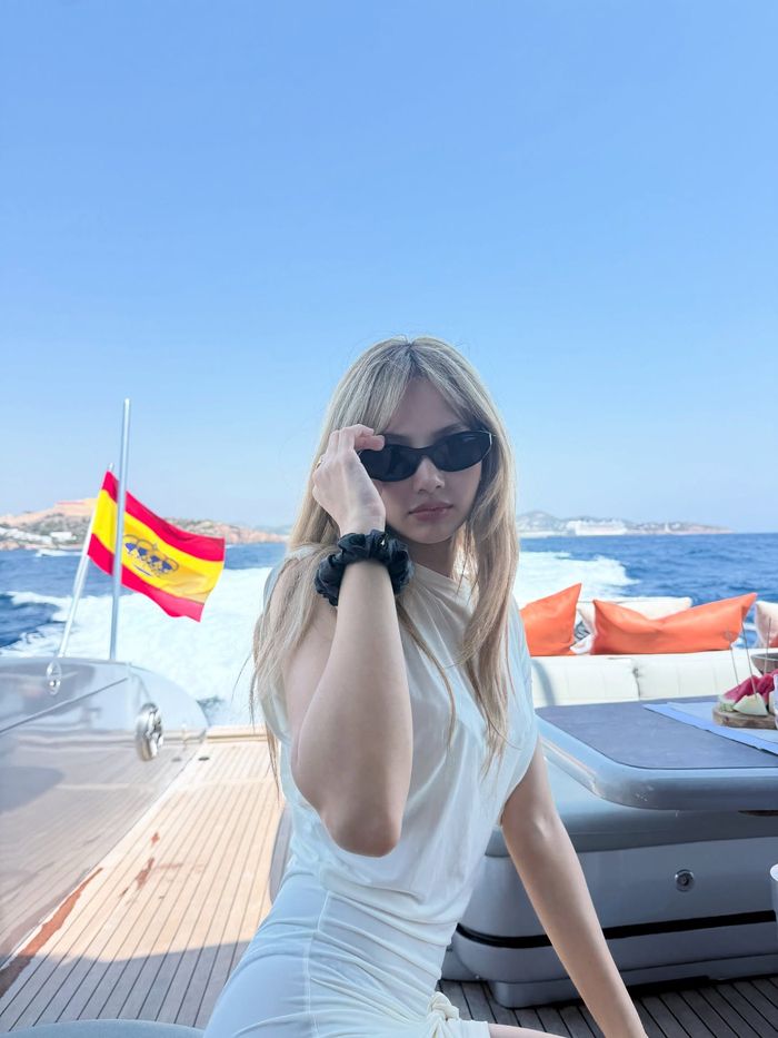 요트 위에서 촬영된 사진에서는 리사 특유의 카리스마와 자유로움이 느껴진다. 깔끔한 화이트 투피스 차림에 블랙 스크런치를 착용하고, 선글라스를 가볍게 내린 채 바다 너머를 바라보는 모습이 인상적이다. 요트 데크에서 환하게 펼쳐진 바다 풍경 속 카리스마 있는 포즈는 리사의 여유로움을 극대화했다.