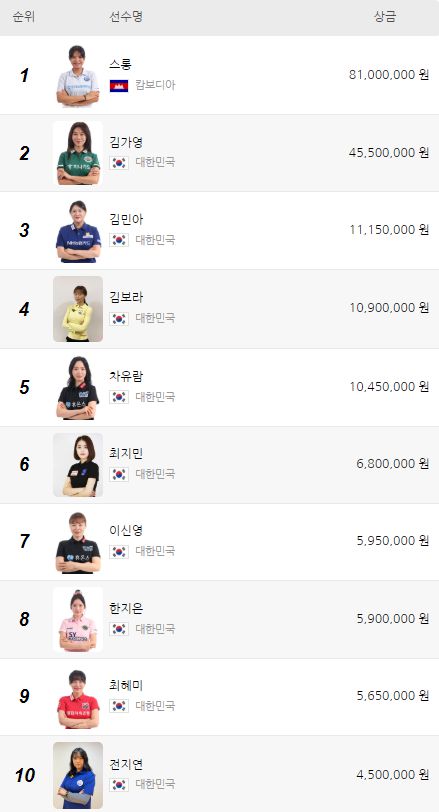 LPBA 상금 랭킹: '캄보디아 특급' 스롱 피아비의 독주 체제