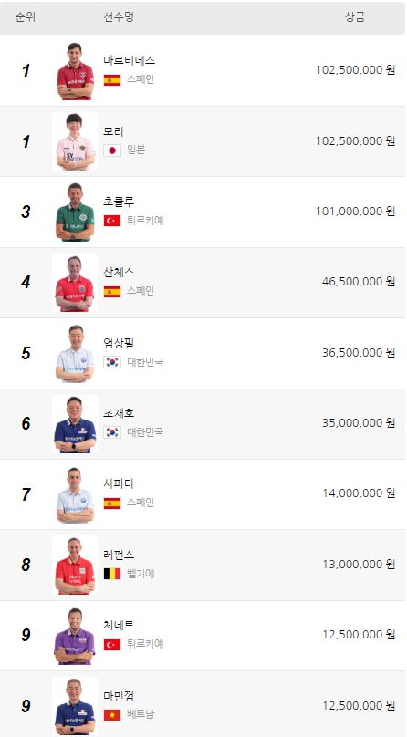 시즌 초반 3개 대회가 끝난 현재, PBA 상금 랭킹 최상단은 '1억 클럽'을 선점한 외국인 선수들이 점령했다. 2차 투어 우승자 다비드 마르티네스(스페인)와 3차 투어 챔피언 모리 유스케(일본)가 나란히 1억 250만원으로 공동 1위에 올라있다. 개막전 우승자 무라트 나지 초클루(튀르키예)는 1억 100만원으로 그 뒤를 바짝 쫓고 있다.
