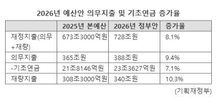 의무지출이란, 국민연금·기초연금처럼 법령에 지출 근거와 규모가 명확히 규정돼 예산 편성 시 정부의 의지와 관계없이 반드시 지출해야 하는 항목이다. 의무지출이 늘어나면 재정 부담이 커지고 예산을 통한 경기 대응력은 떨어진다. 2026년 예산안에서 정부 총지출 728조원 중 의무지출은 388조원(55.3%)다. 2029년에는 총 지출 중 465조7000억원의 55.8%까지 비중이 늘어날 것으로 예상된다.