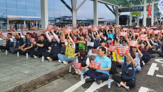 30일 인천공항 제2여객터미널에서 민주노총 공공운수노조 인천공항지부 소속 조합원들이 총파업 출정식을 진행하고 있다. 이승욱기자 |