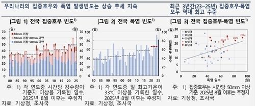 한국은행이 31일 발표한 ‘최근 집중호우와 폭염의 성장·물가 영향’ 보고서에 따르면, 집중호우·폭염이 집중되는 3분기 성장률이 2020년대(20~25년) 들어 2010년대 대비 약 0.1% 포인트(연간 0.04% 포인트) 감소한 것으로 추정됐다. 시간당 30㎜ 이상 쏟아지는 집중호우는 2000년대 평균 39일에서 2020년대 49일로 23.9% 늘었다. 일 최고기온 33도 이상을 기록한 폭염일수도 2020년대 평균 67일로 2000년대 46일 대비 44.9% 늘었다. 한은은 “2023년 이후 최근 3년간은 기록적인 집중호우와 폭염이 잇따라 발생하면서 경제 전반에 미치는 부정적 충격이 가중되었을 가능성이 높다”고 봤다.
