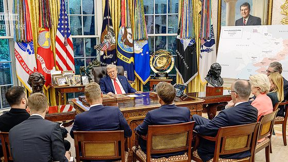 도널드 트럼프 미국 대통령이 18일(현지시간) 백악관 오벌오피스에서 유럽 정상들과 우크라이나 안보 보장안을 논의하고 있다. 백악관은 ″트럼프 대통령이 평화의 수장″이라고 말했다. 백악관 X 캡처