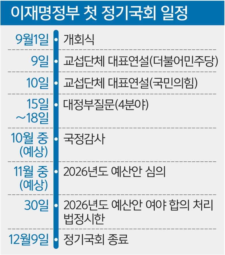 31일 정치권에 따르면 국회는 1일 본회의장에서 개회식을 연다. 9일과 10일에는 각각 민주당과 국민의힘이 교섭단체 대표 연설을 하고, 15∼18일엔 대정부질문이 예정돼 있다. 민주당은 10월13일부터 국정감사를 시작하자고 국민의힘에 제안, 답변을 기다리고 있다.