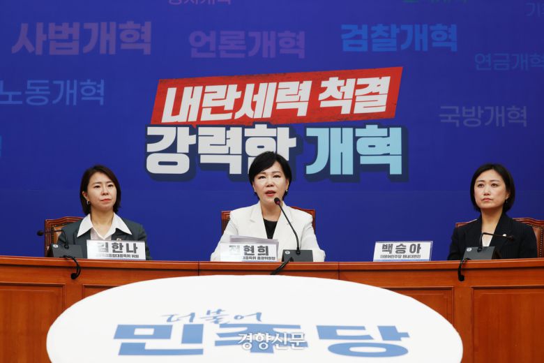 당 3대특검 종합대응 특별위원회 위원장인 전현희 수석최고위원은 31일 국회에서 열린 기자회견에서 “사법부가 국민 신뢰를 잃은 상황에서 특단의 대책이 필요하다는 목소리가 높다”며 “내란특별재판부 설치를 검토하겠다”고 말했다.