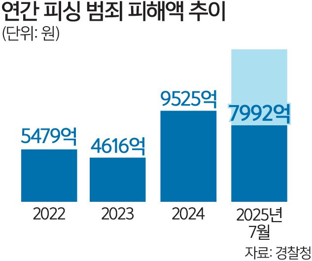 올해 보이스피싱 등 피싱범죄 피해액이 7월 기준으로 약 이미 8000억원에 달하며 역대 최고치를 찍은 것으로 나타났다. 올해 말에는 사상 처음으로 1조원을 돌파할 수도 있다는 전망까지 나온다. 지난해부터 이어진 피싱범죄 증가세가 수그러들 기미를 보이지 않자 경찰은 9월1일부터 피싱범죄에 대한 대대적인 특별단속에 착수하기로 했다.
