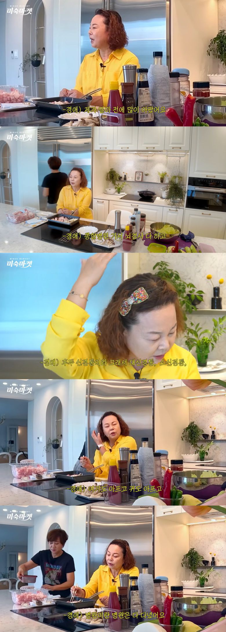 이날 이경애는 "제가 얼마 전에 많이 아팠다. 종합병원 가서 뇌 검사 다 하고 스캔 다 했다"며 좋지 않았던 몸 상태를 깜짝 고백했다.