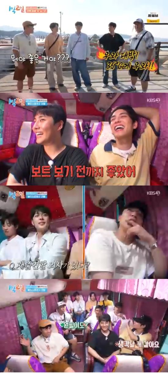 버스에서 다시 만난 멤버들은 서로 관광코스 후기를 풀었다. 도보를 하고 온 영케이는 보트 팀이었던 원필에게 "좋았다. 보트 보기 전까지 좋았다"고 얘기했다.