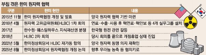 하지만 2017년 불거진 한국형 원전(APR-1400)을 둘러싼 한국수력원자력·웨스팅하우스 간 지식재산권 분쟁과 문재인 정부의 탈원전 정책이 맞물리며 이후 7년 동안 ‘개점휴업’ 상태였다. 웨스팅하우스는 원전과 관련한 다양한 원천 기술을 보유한 기업으로 미국 에너지부의 강력한 통제를 받는다. 지난해 체코 원전 진출을 놓고 한수원과 충돌했고, 윤석열 정부가 이면 합의를 추진했다가 적절성을 놓고 논란이 불거진 상태다.