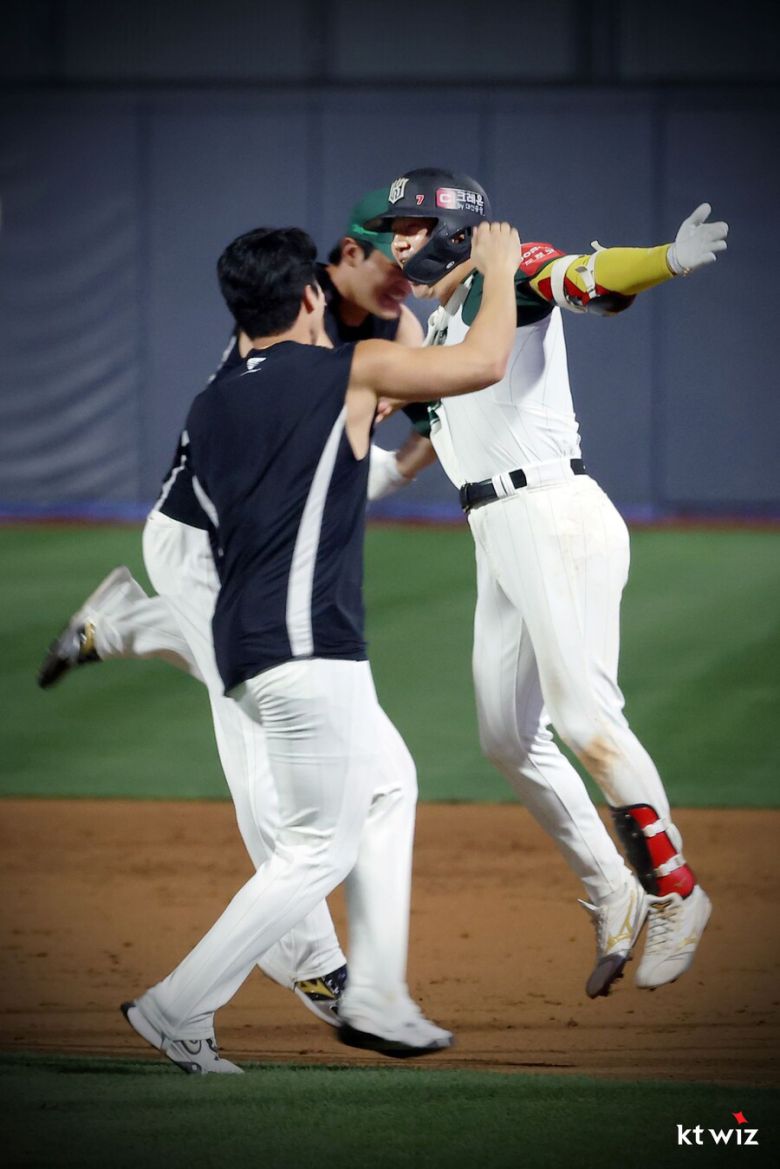 경기 후 이강철 KT 감독은 “선발 오원석이 자기 역할을 다했다. 타선에서는 실점 후 곧바로 따라가는 안현민의 동점 타점을 시작으로 베테랑 황재균, 장성우, 허경민의 추가 타점으로 경기 분위기를 가져왔다”면서 “9회 마지막 공격에서 선수들이 포기하지 않고 집중력을 발휘했다. 스티븐슨과 황재균이 찬스를 만들고, 좋은 타격감을 보여준 장성우의 타점과 김상수의 끝내기 안타로 승리할 수 있었다”고 돌아봤다.