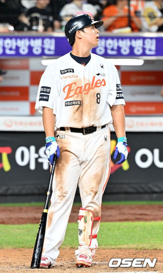 [OSEN=대전, 민경훈 기자] 한화 노시환이 타석에서 루킹 삼진아웃을 당한 후 아쉬워하고 있다. 2025.08.07 / rumi@osen.co.kr |