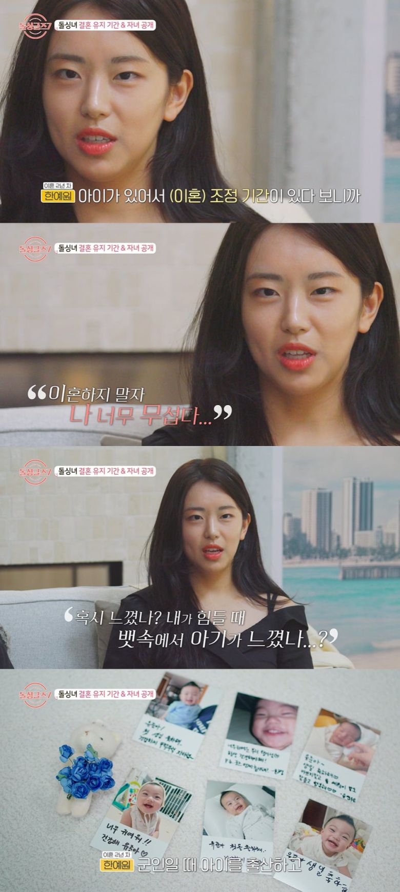 또한 아이를 위해 전 남편에게 무릎을 꿇은 사연을 전해 안타까움을 자아냈다. 그는 "아이가 있어 조정 기간이 있다 보니 별거하면서도 나름대로 노력을 많이 했다"며 "만삭인 채로 전 남편 앞에서 무릎 꿇고 빌면서 '이혼하지 말자. 나 너무 무섭다'고 말했다"고 얘기했다.