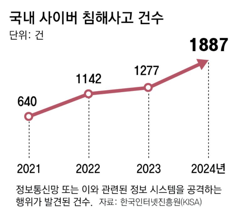 실제 한국인터넷진흥원(KISA) 집계에 따르면 사이버 침해 사고 건수는 2023년 1277건에서 지난해 1887건으로 약 48% 늘었다. 올해 7월까지 신고 건수는 1242건으로, 같은 추세라면 올해는 더 늘어날 것으로 전망된다.