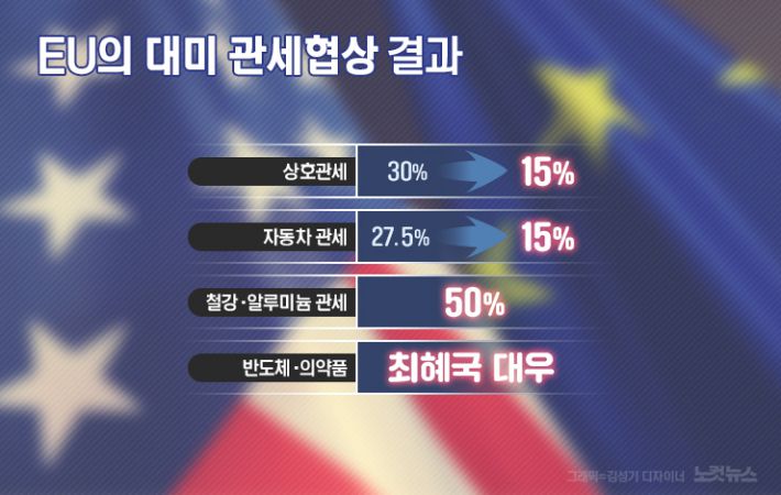 미국과 EU는 "미국은 EU산 의약품, 반도체, 목재에 부과되는 최혜국대우(MFN) 관세와 무역확장법 232조 조치에 따른 관세를 합산한 (최종) 관세율이 15%를 초과하지 않도록 신속히 보장할 계획"이라고 밝혔다. 유럽산 자동차, 자동차 부품에 붙는 관세도 15%가 적용된다.