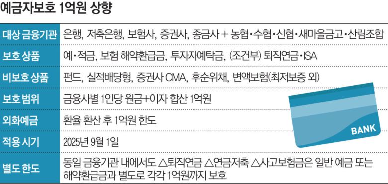 1일 금융당국 등에 따르면 이날부터 전 금융권의 예금보호한도가 5000만 원에서 1억 원으로 두 배 상향됐다. 이로써 금융회사나 상호금융 조합·금고가 파산 등의 이유로 예금을 지급할 수 없는 상황이 발생해도 금융소비자들은 예금을 1억 원까지 보호받을 수 있게 됐다. 예금보호한도 조정은 2001년 이후 24년 만으로 지난 7월 국무회의에서 관련 시행령 개정안이 의결되며 확정됐다.