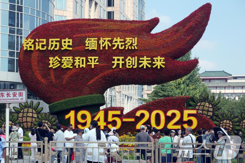 중국의 항일전쟁 및 세계 반파시스트 전쟁(제2차 세계대전) 승리 80주년(전승절) 기념 열병식을 사흘 앞둔 31일 중국 베이징 천안문 인근 거리에 설치된 꽃 조형물 앞에서 행인들이 기념 사진을 찍고 있다. 2025.8.31/뉴스1 ⓒ News1 박정호 기자