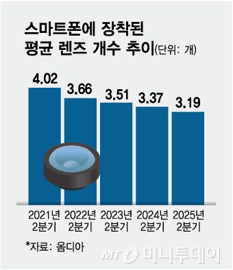 31일 시장조사업체 옴디아에 따르면 글로벌 시장에서 올해 2분기 출하된 스마트폰의 평균 카메라 렌즈 개수는 3.19개로 지난해 같은 기간(3.37개)과 비교해 0.18개 감소했다. 스마트폰의 카메라 렌즈 개수는 2021년 2분기 4.02개를 기록한 후 꾸준히 줄고 있다.