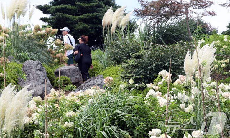 8월19일 오전 제주시 구좌읍 송당리 동화마을에 유럽수국과 함께 가을의 전령사 팜파스그라스가 활짝 펴 계절의 변화를 알리고 있다. 2025.8.19/뉴스1 ⓒ News1 오현지 기자 |
