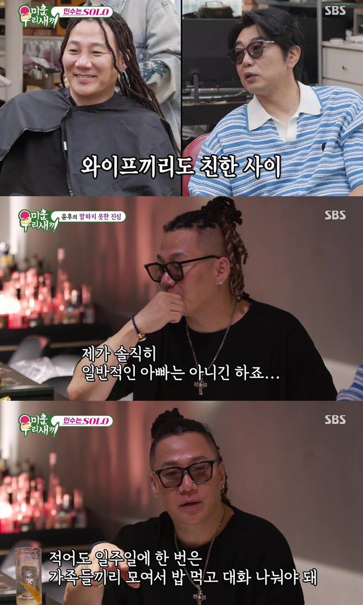 윤민수는 "내가 일반적인 아빠는 아니다. 친구처럼 지내는 관계이긴 한데 내가 조금 지나쳤다고 생각할 수 있다. 후가 속이 깊다"며 아들의 성숙한 면모에 고마움을 전했다. 이어 윤민수는 "적어도 일주일에 한 번은 가족들끼리 모여서 밥 먹고 대화 나눠야한다. 근데 나는 그걸 못한 게 후회스러운 게 많다"며 "그런 것만 했었어도 이렇게까지 되지 않았겠지라는 생각을 한다" 밝혔다.