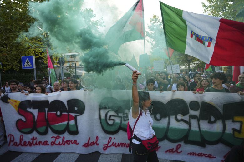 이탈리아 베네치아 리도 섬에서 열리고 있는 세계 3대 영화제 가운데 하나인 제82회 베니스국제영화제에서 2025년 8월30일(현지 시각) 이스라엘의 가자지구 봉쇄를 규탄하는 대규모 시위가 열렸다.