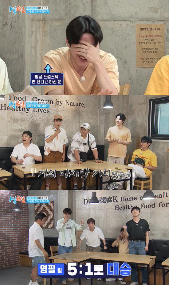 치열한 접전을 예상했지만, 성진과 도운 팀에서 '구멍 멤버' 도운의 부진으로 영필 팀이 5:1 완승을 거두며 풍족한 점심식사를 할 수 있게 되었다. 패자 벌칙인 '김치에 밥만 먹기'에 데이식스 멤버 도운은 "고시원 살 때 이렇게 먹었다"라며 슬픈 과거를 떠올리게 만들었다.