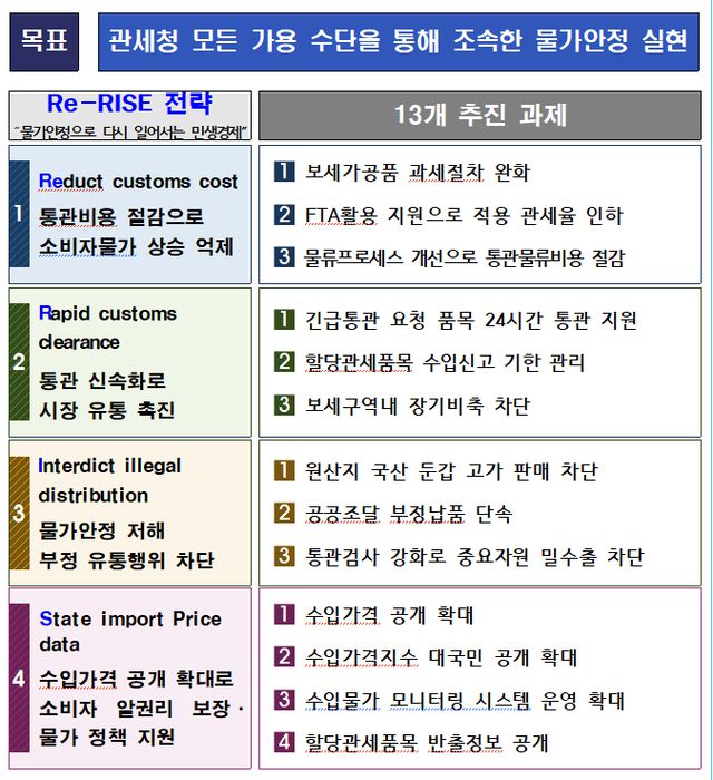 ㅇ 아울러 “매월 추진실적을 점검하고 보완대책을 마련하여, 민생경제가 회복될 때까지 물가안정을 위해 관세청의 모든 가용 수단을 총동원하겠다”고 강조했다.