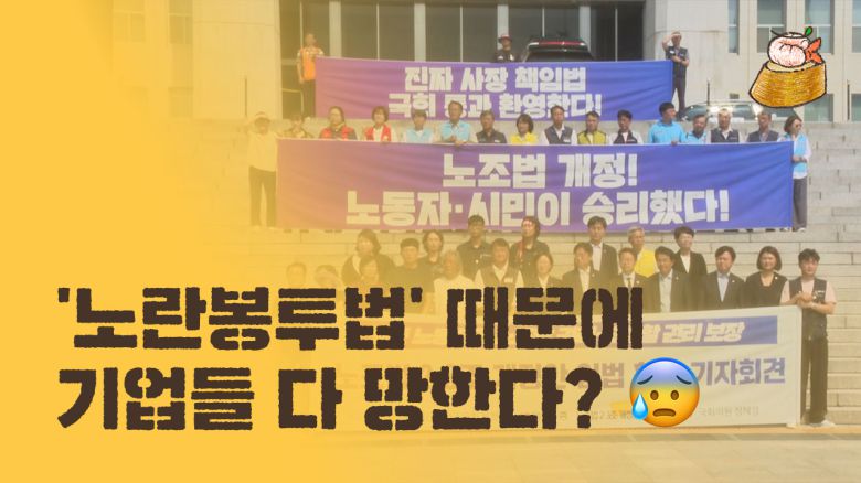 ㆍ 하지만 경총 등 경제 단체에서는 노란봉투법이 노조의 불법 행위를 조장하고, 산업 현장에 혼란을 일으킬 수 있다며 반발하고 있습니다. 제 주변에도 ‘노란봉투법 시행되면 기업들 다 망한다’ 라며 걱정하는 분들이 있는데요. 지금부터는 노동 문제를 오랫동안 취재하고 있는 뉴스타파 홍여진 기자와 함께, 노란봉투법에 대한 오해를 하나씩 풀어 보겠습니다.