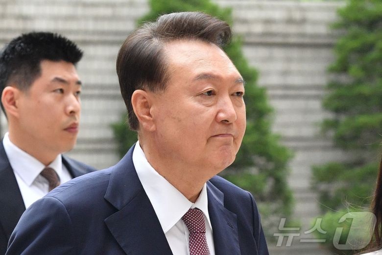 윤석열 전 대통령이 지난 7월 3일 서울중앙지방법원에서 열린 우두머리 혐의·직권남용 권리행사 방해 혐의 사건 9차 공판에 출석하고 있다. /뉴스1 ⓒ News1 사진공동취재단 |