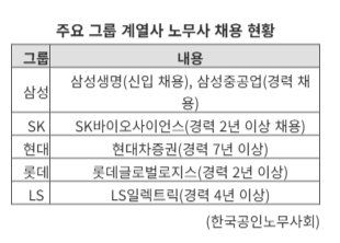SK그룹에서는 SK바이오사이언스가 노무 경력직 직원을 채용하고 있다. 자격요건에는 '2년 이상 경력'이 명시됐다. 현대자동차그룹 자회사 현대차증권도 지난달 말까지 경력 7년 이상 노무사 지원 접수를 받았다. 이밖에도 롯데그룹 계열 롯데글로벌로지스, LS그룹 계열 LS일렉트릭 등이 노무사를 채용했거나 채용하는 중이다. 9월 1일에도 노무사를 구하는 글이 지속 올라오고 있다.