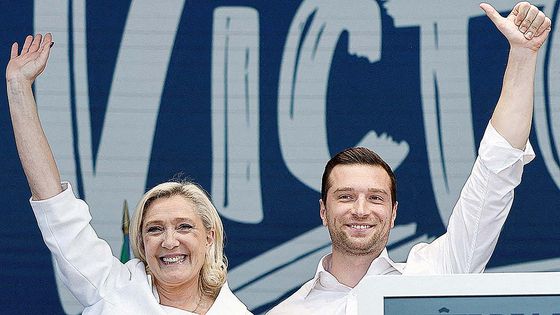 프랑스 극우 지도자이자 국회의원인 마린 르펜과 극우 정당인 국민연합(RN)의 조르당 바르델라 대표가 지난 6월 9일(현지시간) 프랑스 루아레주 모르망쉬르베르니송에서 열린 행사에서 무대에 올라 손을 흔들리고 있다. 로이터=연합뉴스 |