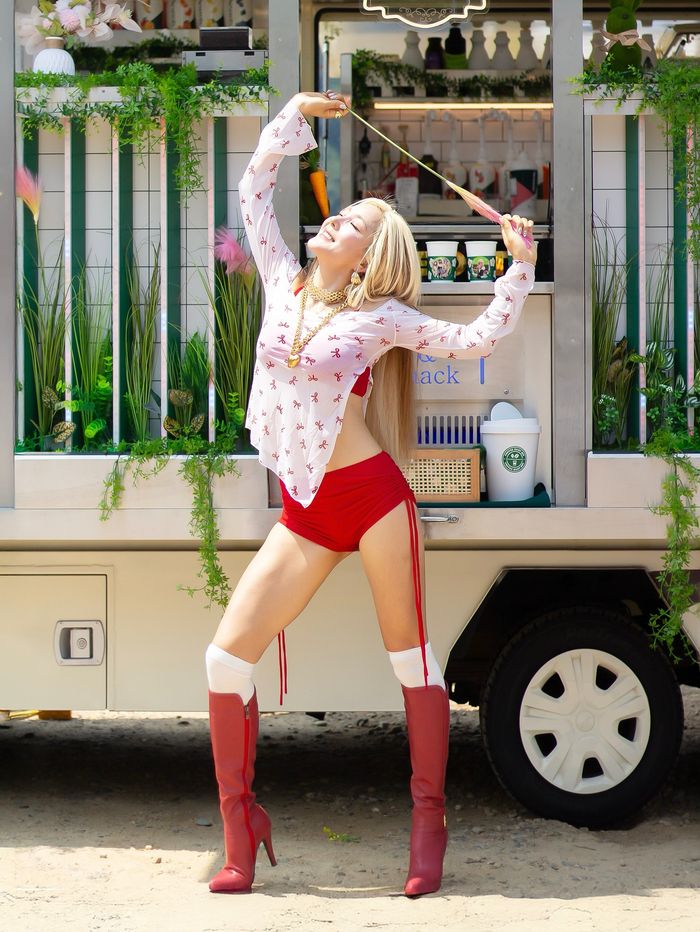 특히, 체크무늬 미니스커트에 노란색 홀터넥 톱을 매치해 발랄한 매력을 뽐내거나, 흰색 레이스 원피스와 카우보이 모자로 청순하면서도 몽환적인 분위기를 연출했다. 또 다른 사진에서는 파란색 브라톱에 데님 핫팬츠를 입고 탄탄한 복근을 드러내며 40대라는 사실이 믿기지 않는 명품 몸매를 선보였다.