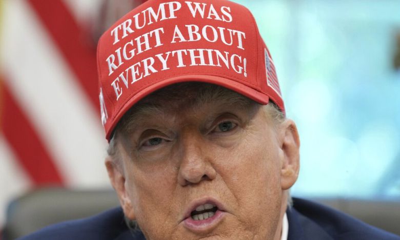 22일 미국 워싱턴디시 백악관에서 도널드 트럼프 미국 대통령이 발언하고 있다. 모자에는 ‘트럼프 대통령이 모든 면에서 옳았다’는 글이 새겨져 있다. AP연합뉴스 |